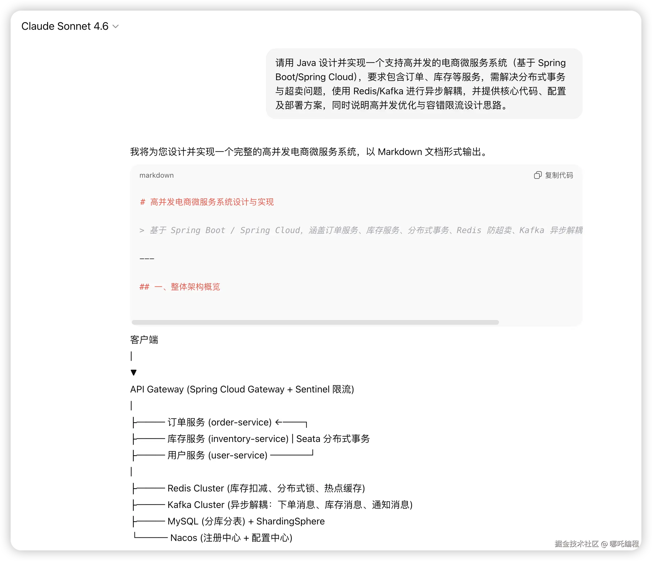 请用 Java 设计并实现一个支持高并发的电商微服务系统(基于 Spring Boot/Spring Cloud),要求包含订单、库存等服务,需解决分布式事务与超卖问题,使用 Redis/Kafka 进行异步解耦,并提供核心代码、配置及部署方案,同时说明高并发优化与容错限流设计思路。