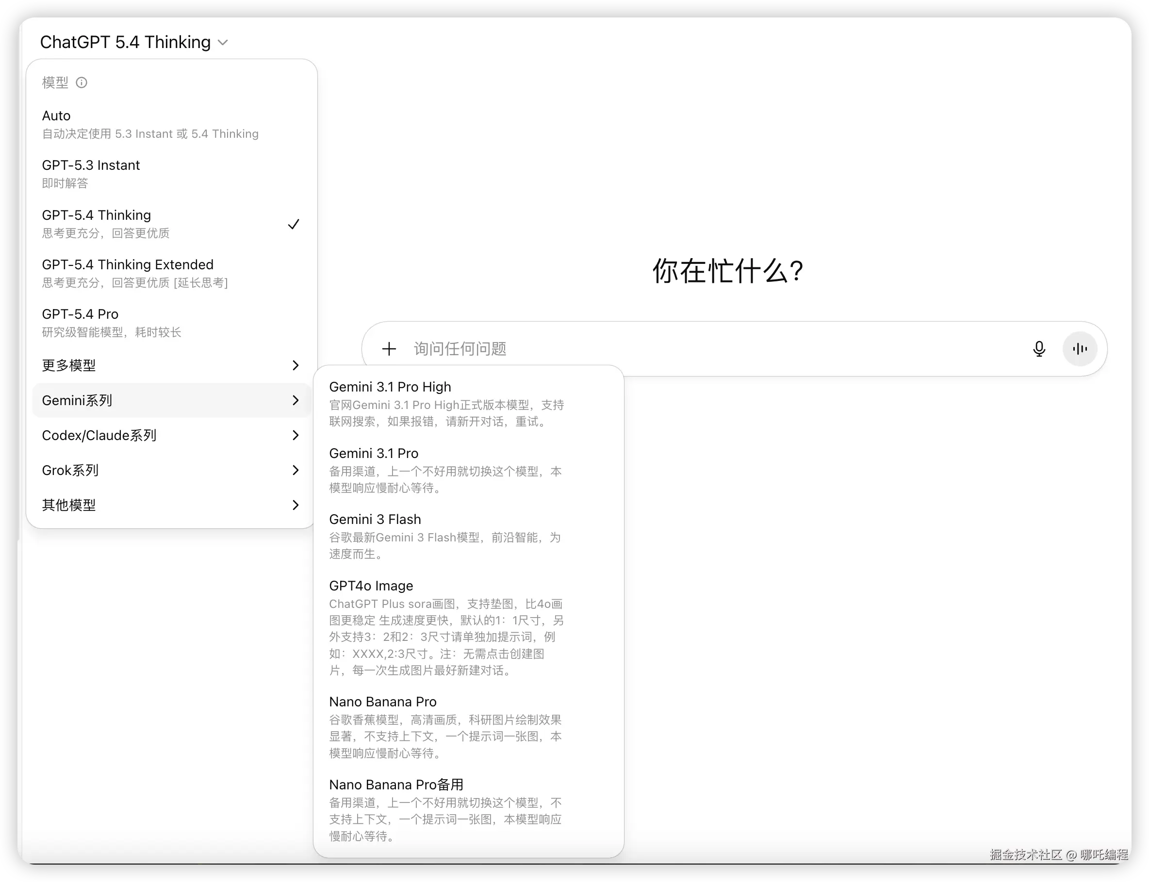 包含GPT 5.3、GPT 5.4 Thinking、GPT 5.4 Pro、Gemini 3.1 Pro、Nano Banana Pro、Claude Sonnet 4.6、Codex、Grok4.2等模型。