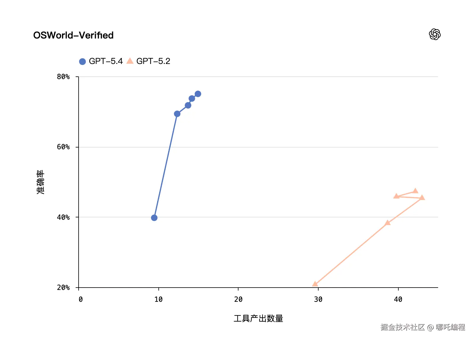 结果非常亮眼:GPT-5.4 在 83.0% 的任务对比中达到或超越了人类行业专家水平,而 GPT-5.2 的这一数字为 70.9%。这意味着 GPT-5.4 已经在绝大多数专业工作中具备了与资深从业者相媵美甚至更优的能力。