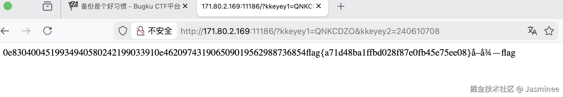 key1和key2的MD5值相等但本身不等,直接用 0e 字符串 或者 数组绕过: