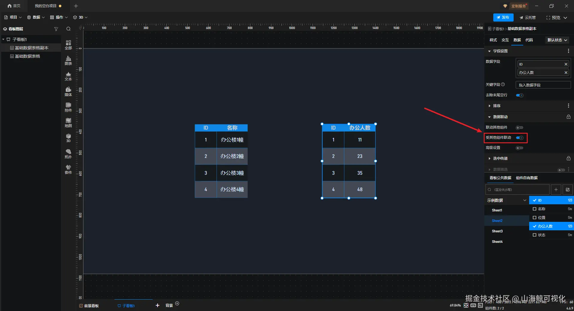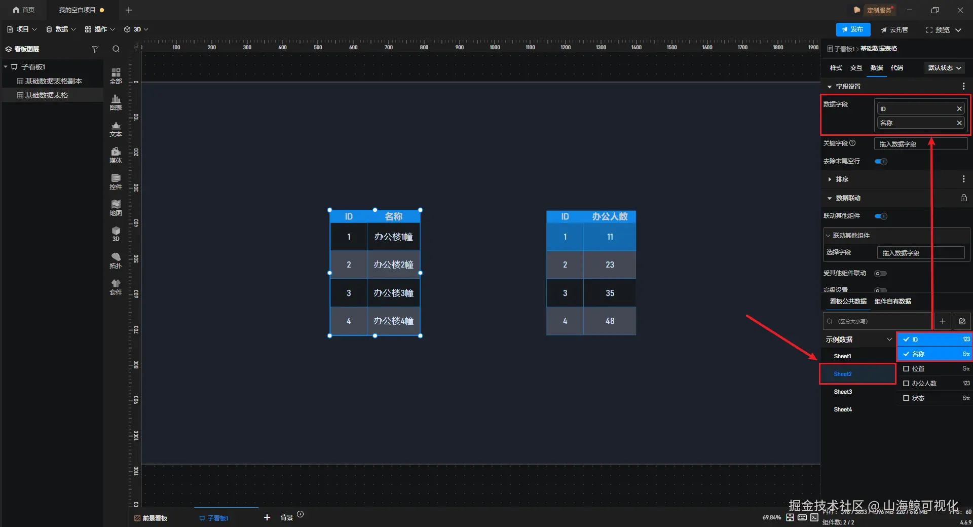 【山海鲸实战案例】如何设置两个数据表格之间的联动? 山海鲸可视化 2026-03-07 23 阅读1分钟 在制作数据可视化项目时,我们可能会需要两个 “数据表格” 组件之间存在联动效果,下面我们就来看一下,该如何设置两个 “数据表格” 组件之间的联动。 首先,在项目中添加两个 “数据表格” 组件。 接着为两个 “数据表格” 组件添加数据字段,需要保证二者都有至少一列数据能够互相匹配。 选中其中一个组件,开启 “联动其他组件” 。 另一个组件开启 “受其他组件联动” 。 最终效果如下图所示: