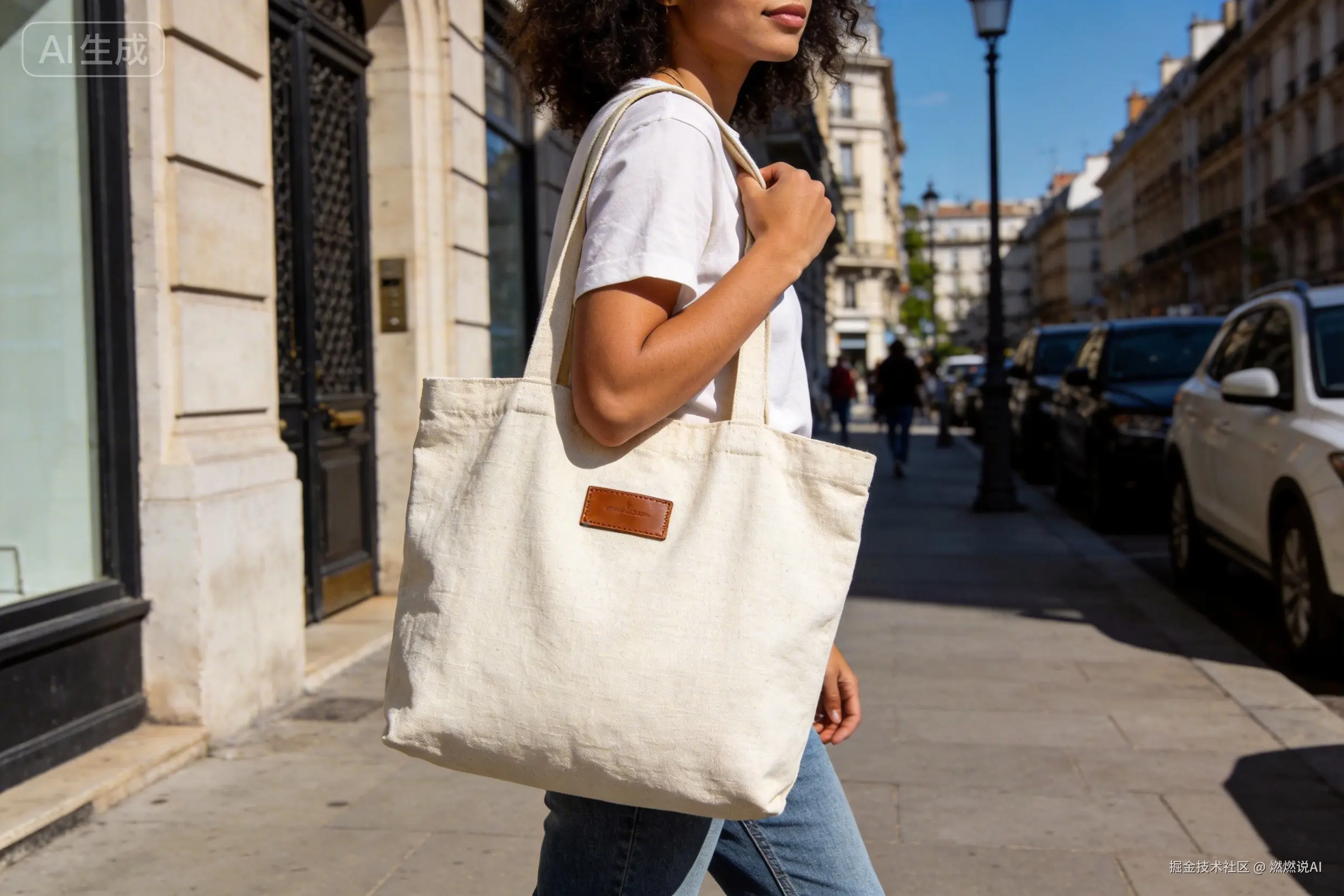帆布托特包,米白色棉麻材质,有简约的棕色皮标装饰,模特单肩背着走在城市街道上,阳光明媚的午后,街拍生活风格,自然不做作