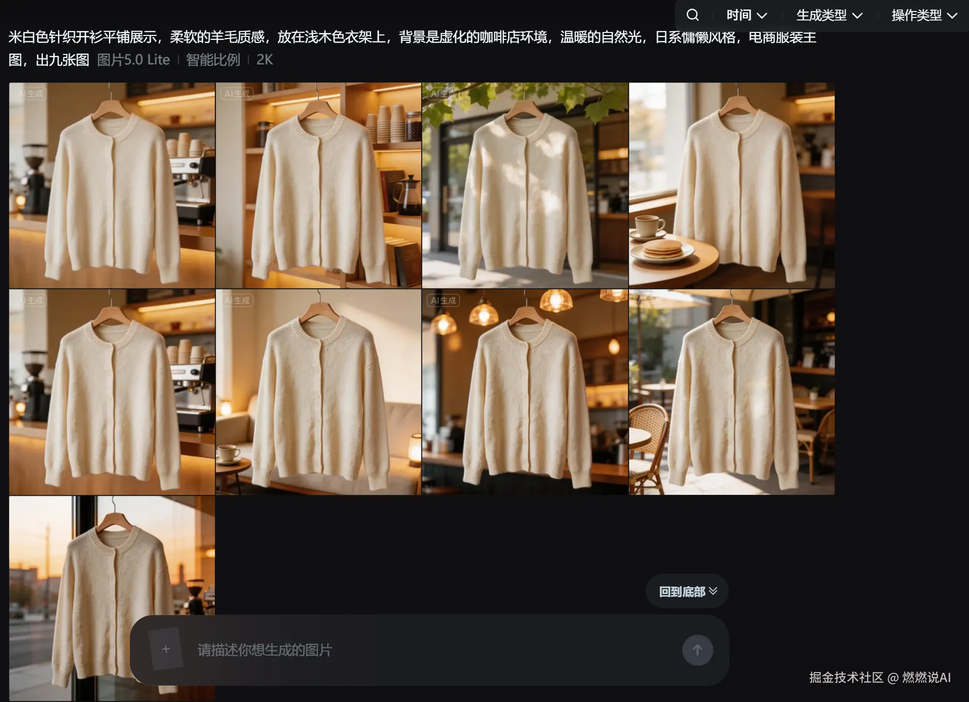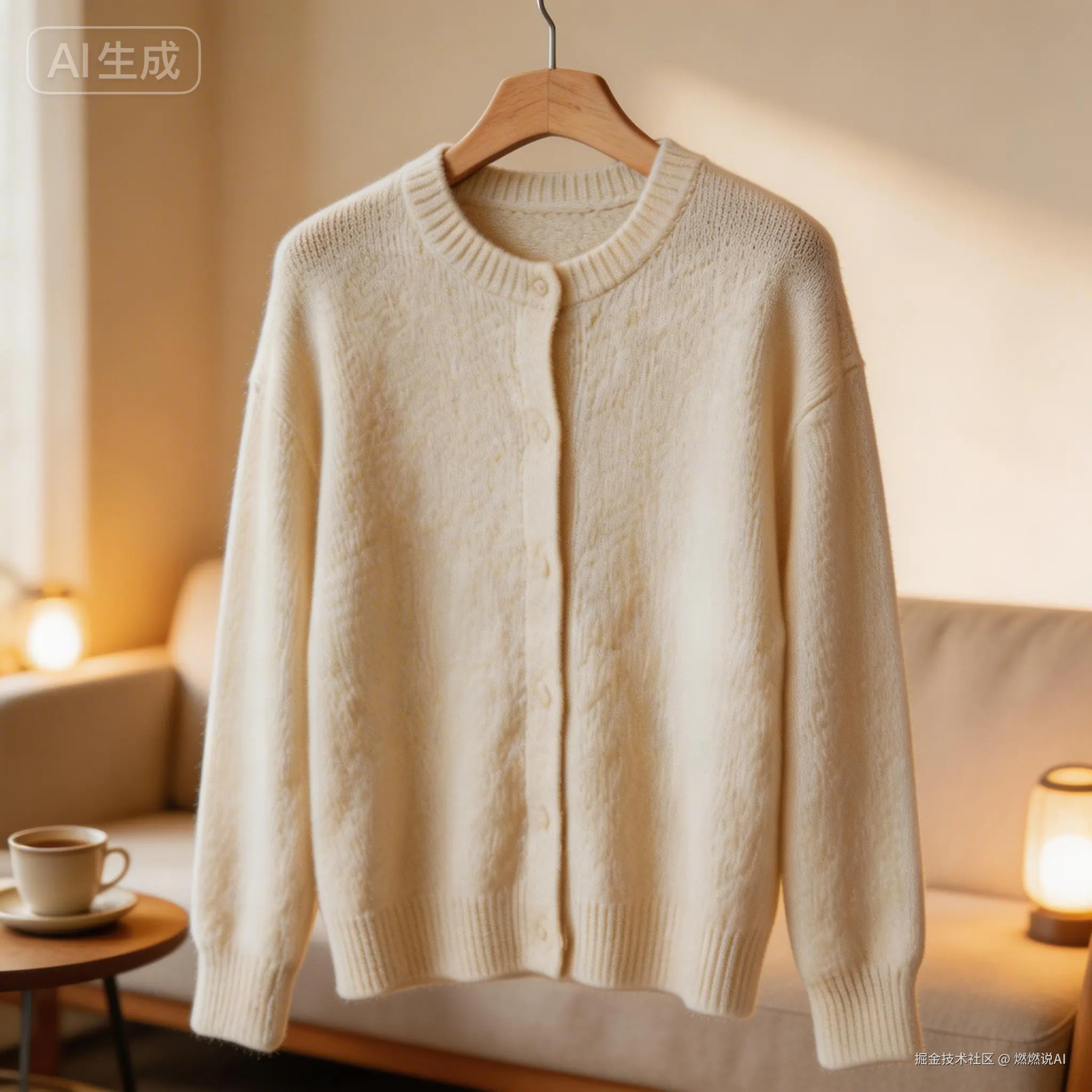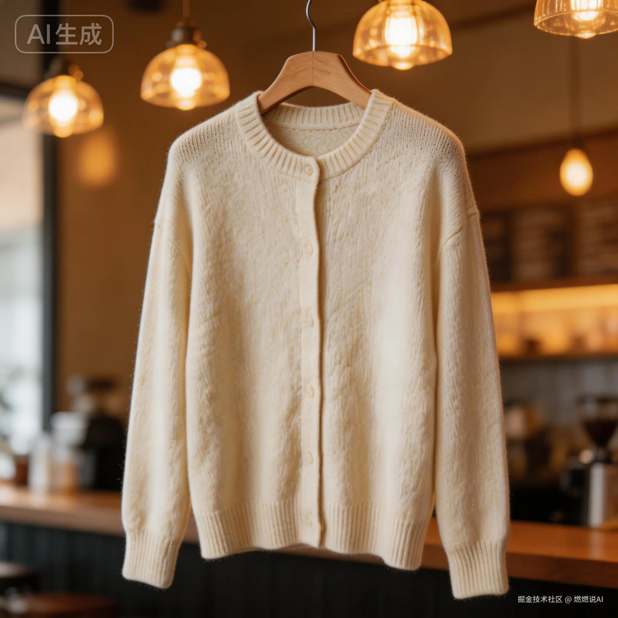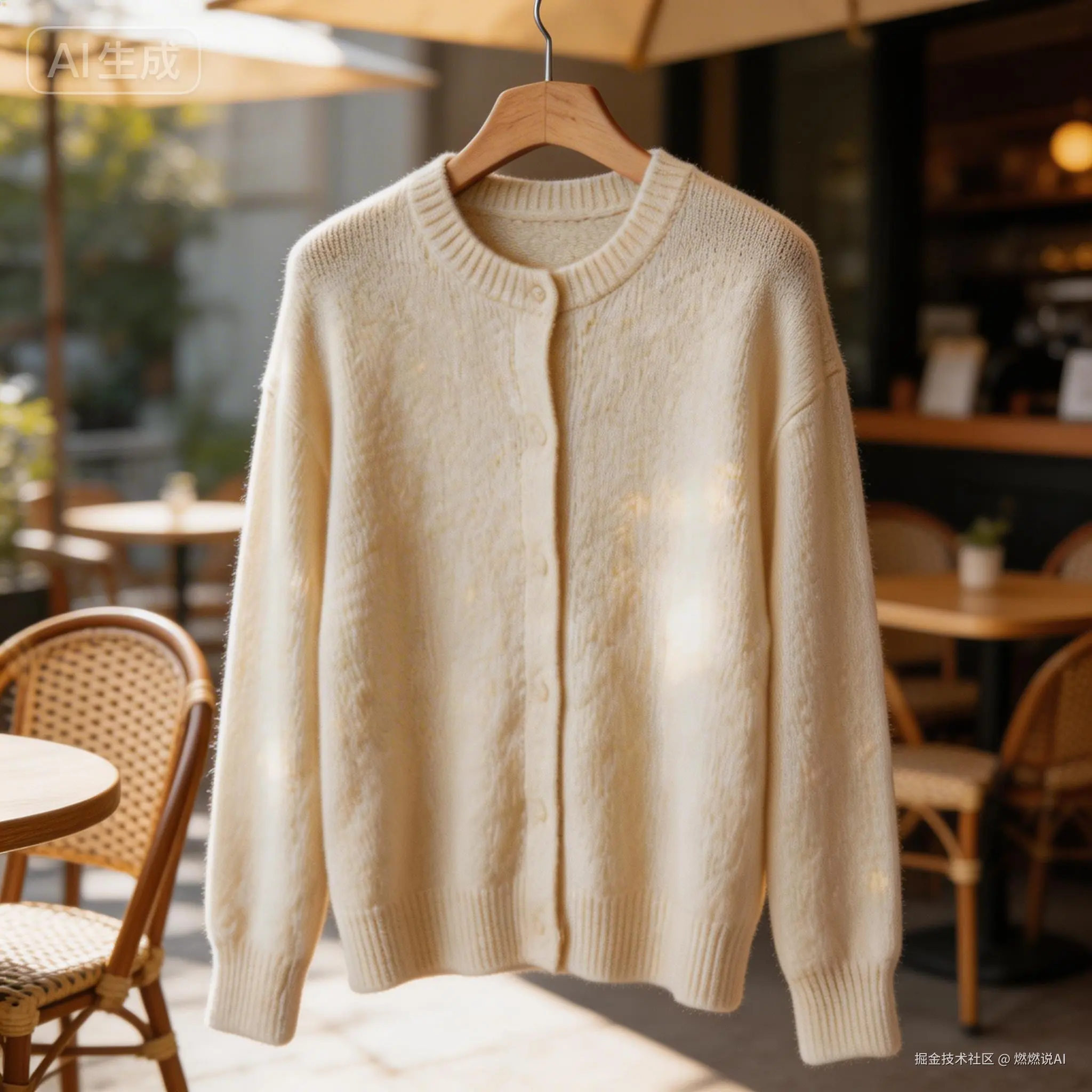 这张图的光影和质感都特别好,衣服的纹理细节很真实。一次出了9张,我挑了3张轮播用。