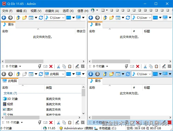 Q-Dir(Quad-Directory Explorer)是一款专为 Windows 设计的免费多窗口文件管理器,最新版本为 v12.49(2026年2月发布)。它最大的特色是支持在一个界面中同时显示 1-4 个独立的文件浏览窗口,大幅提升文件整理和跨目录操作的效率。