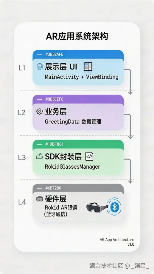为什么单独抽一层 SDK 封装?因为 Rokid 的蓝牙连接流程比较特殊,需要处理各种回调和状态,封装后上层调用就变得非常简单。