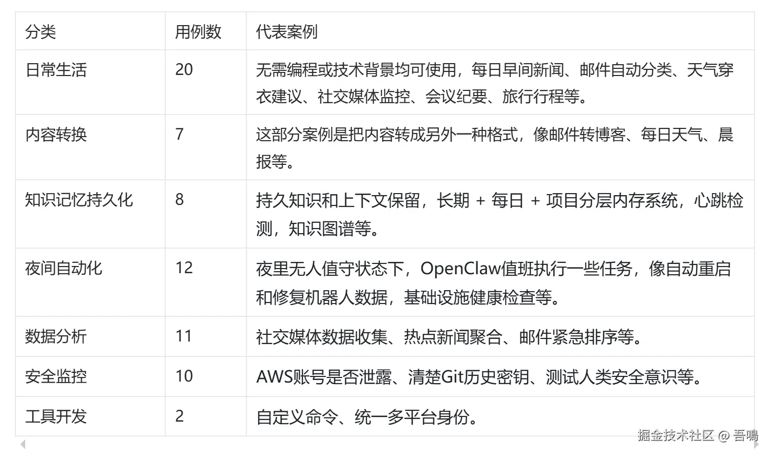 这个仓库包含了OpenClaw 70+优秀的实战案例,囊括了日常生活、内容创作、知识与记忆持久化、安全监控等,具体的案例分类汇总如下: