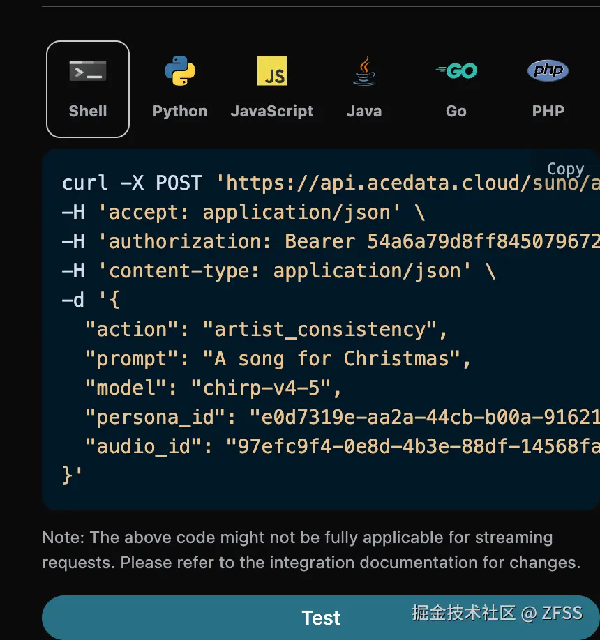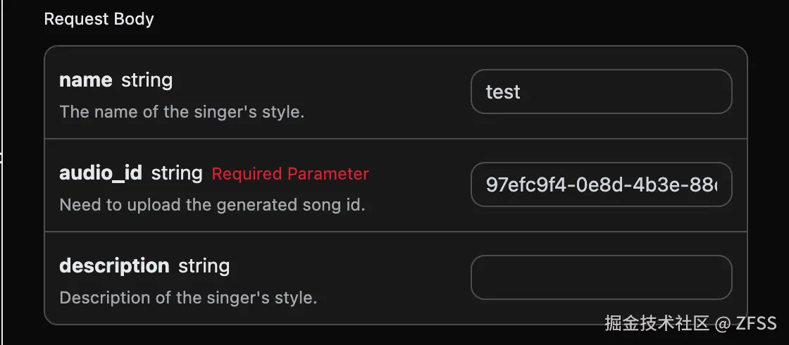 最后得到了需要设置这个歌曲为歌手风格,然后需要进入Suno Persona API根据官方生成的音乐 ID audio_id 来生成一个歌手风格的 id 参数 persona_id,具体的参数如下图所示: