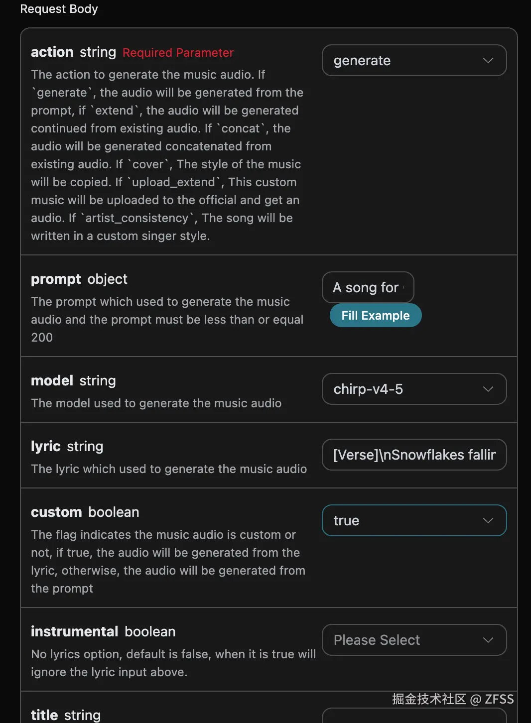 true,代表自定义生成,该参数默认为 false,代表使用prompt生成。 - title:歌曲的标题。