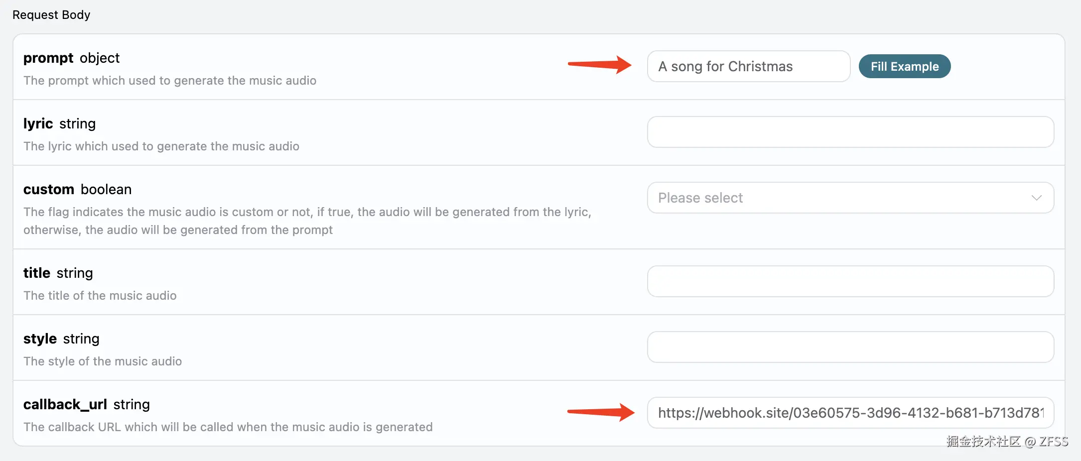 接下来,我们可以设置字段 callback_url 为上述 Webhook URL,同时填入 prompt,如图所示: