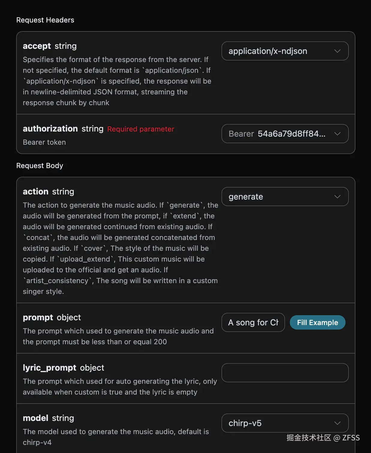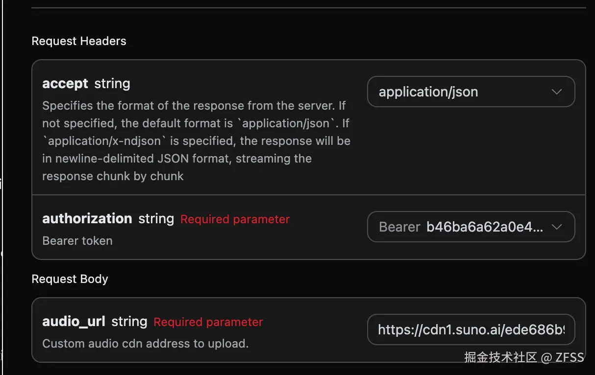 accept:想要接收怎样格式的响应结果,这里填写为application/json,即 JSON 格式。authorization:调用 API 的密钥,申请之后可以直接下拉选择。