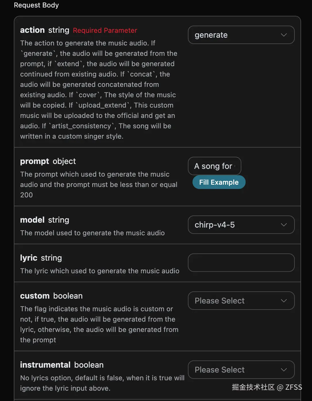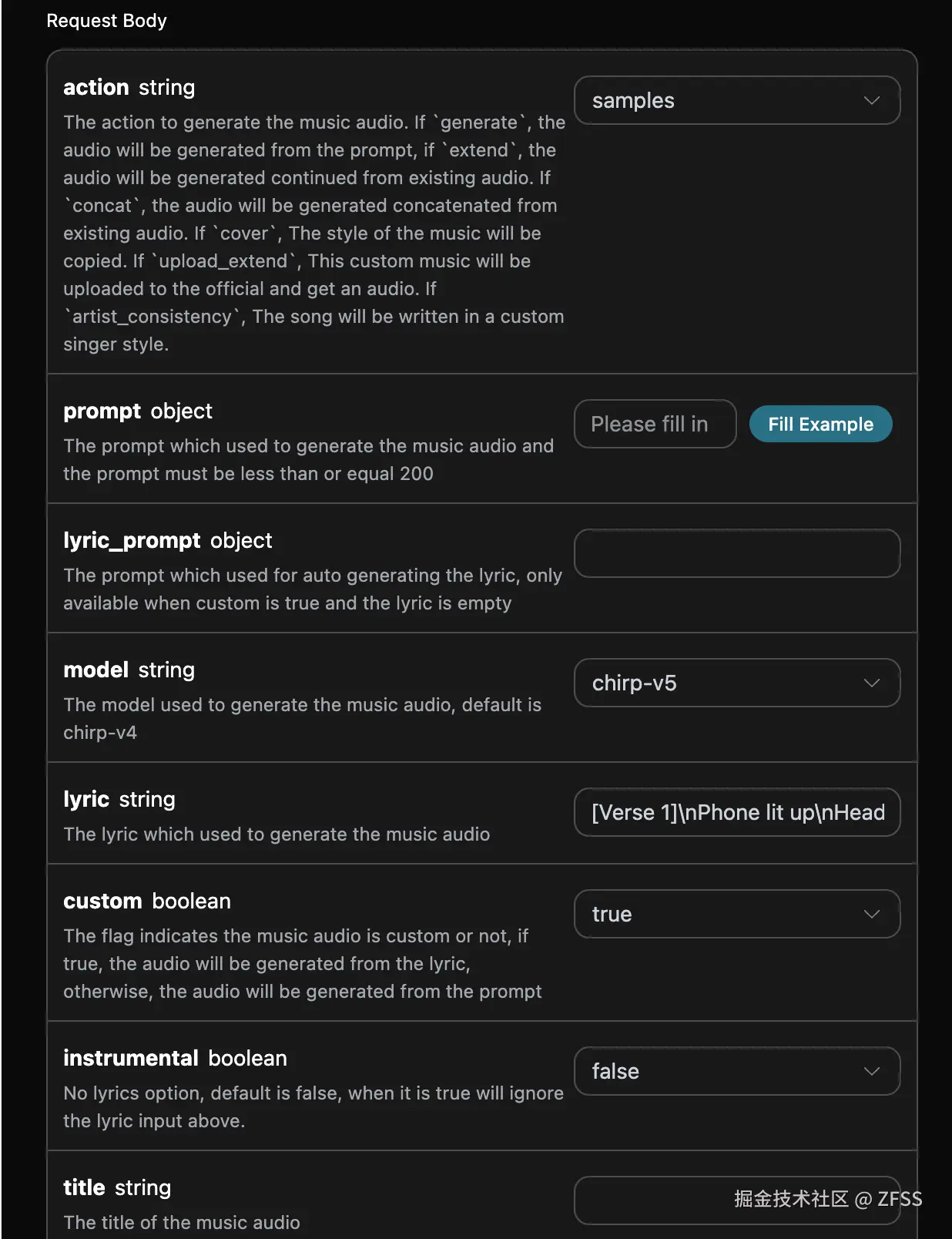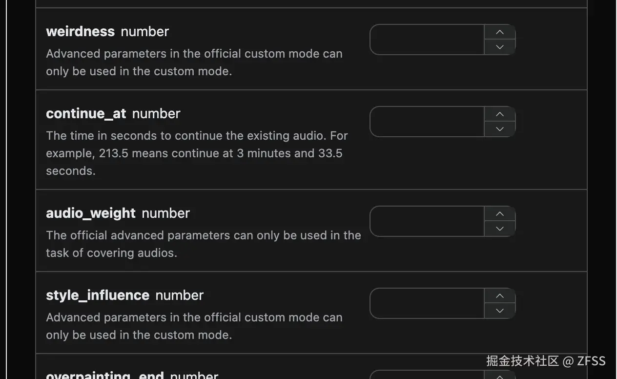 action:此次音乐生成任务的行为,默认是generate,主要包含:extend、upload_extend、cover、upload_cover、replace_section、replace_section、concat、stems、all_stems、remaster。prompt:Suno 官方的灵感模式的提示词。model:此次音乐生成任务的模型,默认是chirp-v3-5,主要包含:chirp-v3、chirp-v4、chirp-v3-5、chirp-v4-5、chirp-v4-5-plus、chirp-v5。lyric:Suno 官方的自定义模式的歌词内容。custom:是否采用自定义模式,默认是:false。instrumental:Suno 官方的灵感模式的纯音乐选项。title:Suno 官方的自定义模式的音乐标题。style:Suno 官方的自定义模式的音乐风格。style_negative:Suno 官方的自定义模式的排除风格。audio_weight:上传的参考音频占比,范围 0-1,越大越依赖参考音频。audio_id:参考音乐的 ID。overpainting_start/overpainting_end:为已有纯音乐补充人声的起止时间,单位秒。underpainting_start/underpainting_end:为清唱加伴奏的起止时间,单位秒。persona_id:艺术家的歌曲 ID。continue_at:以秒为单位继续现有音频的时间。例如,213.5 表示继续到 3 分 33.5 秒。style_influence:style_influence高级参数。replace_section_end:替换片段的最终时间。replace_section_start:替换片段的起始时间。vocal_gender:控制男女声,女声f,男声m,4.5 及以上模型有效。weirdness:weirdness高级参数。lyric_prompt:生成歌词的 prompt,当且仅当custom为true并且lyric没有传的时候生效。callback_url:需要回调结果的 URL。