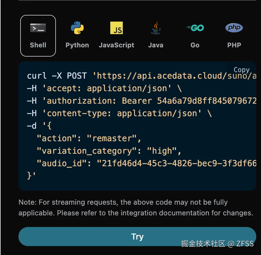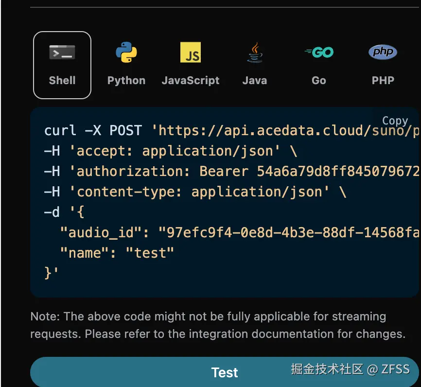要使用 Suno Audios API,首先可以到 Suno Audios Generation API 页面点击「Acquire」按钮,获取请求所需要的凭证: