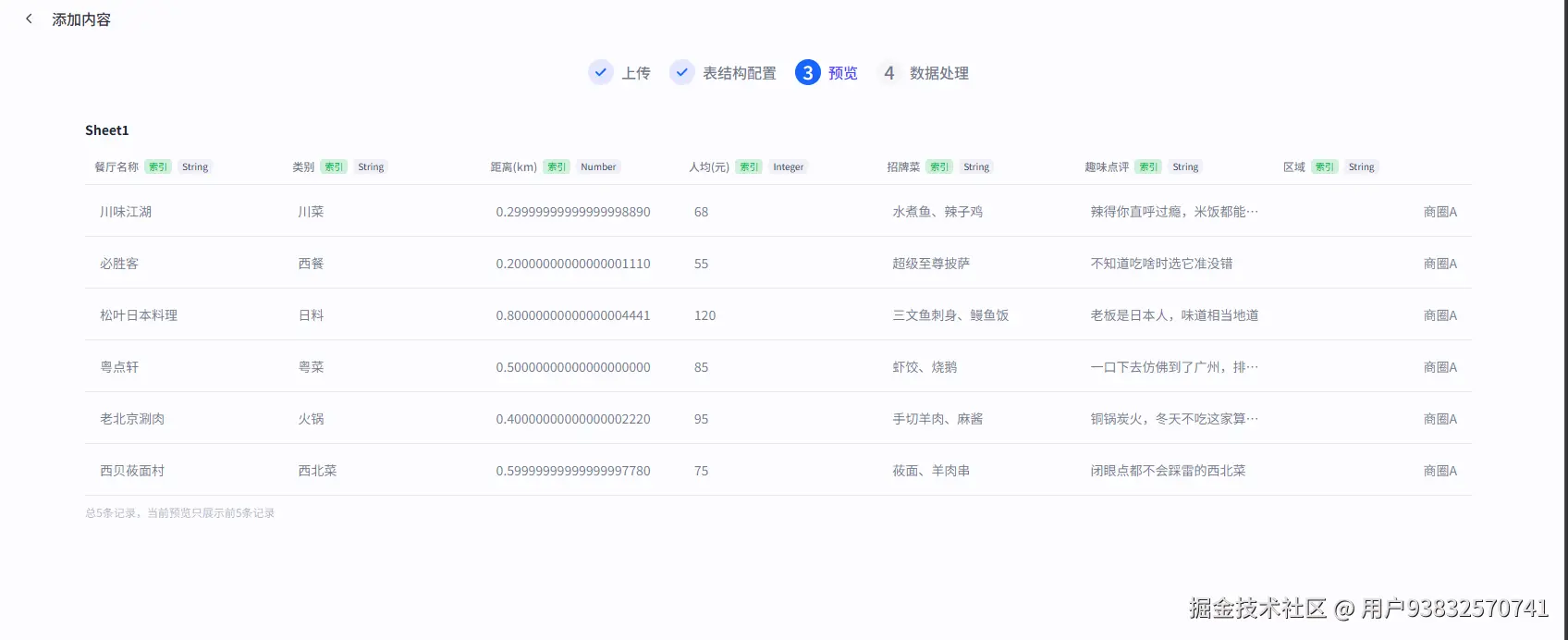 没有真实API,就用预置数据。在平台左侧“资源”->“知识库”中,我创建了一个名为“周边餐厅库”的知识库,并以表格形式录入了6家示例餐厅。这些数据涵盖了不同菜系、价格和距离,足够模拟真实场景。