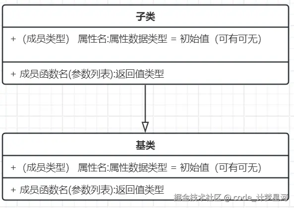 继承:用带空心三角头的实线表示,箭头从子类指向父类
