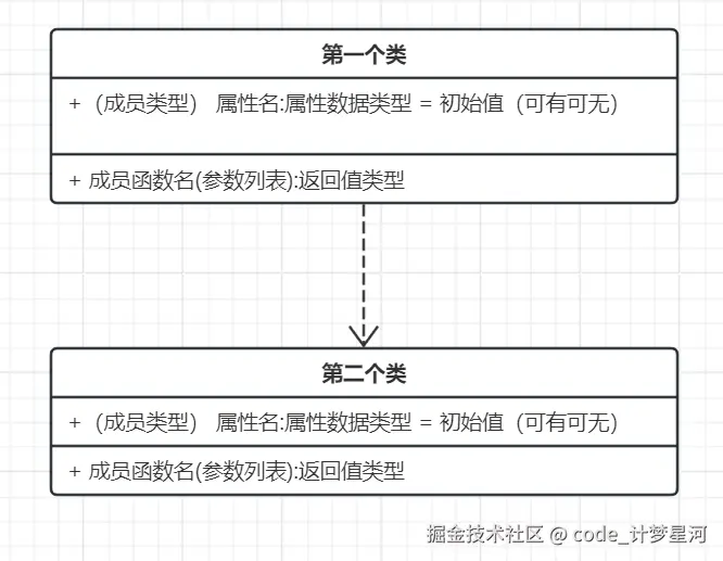 依赖:用带箭头的虚线表示,箭头指向被依赖的类
