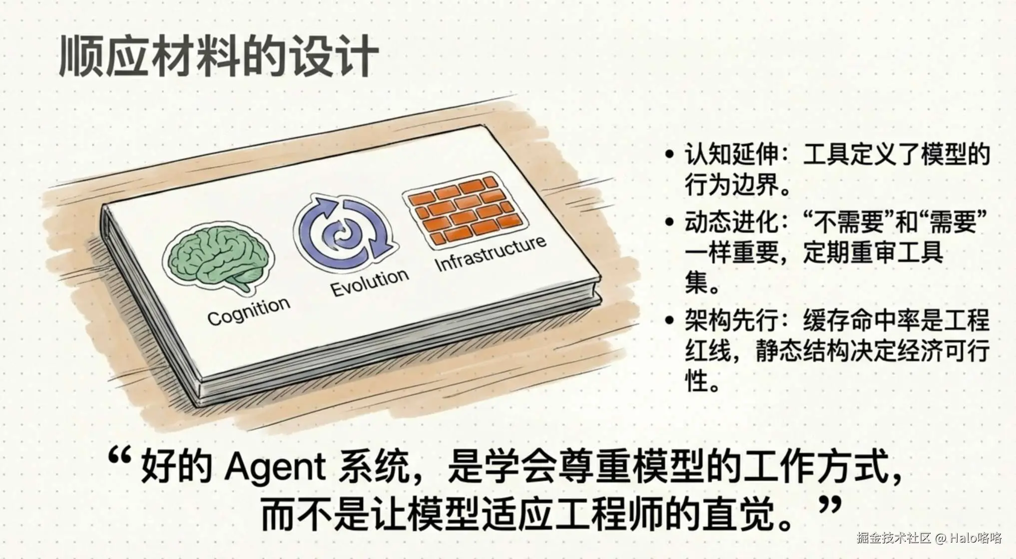 对于正在做 Agent 产品的人来说,最实际的建议可能就是:从第一天起就围绕缓存设计架构,然后花大量时间观察模型怎么使用你给它的工具。前者是工程问题,有明确的对错;后者更接近手艺,需要耐心和经验积累。