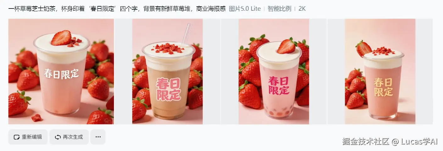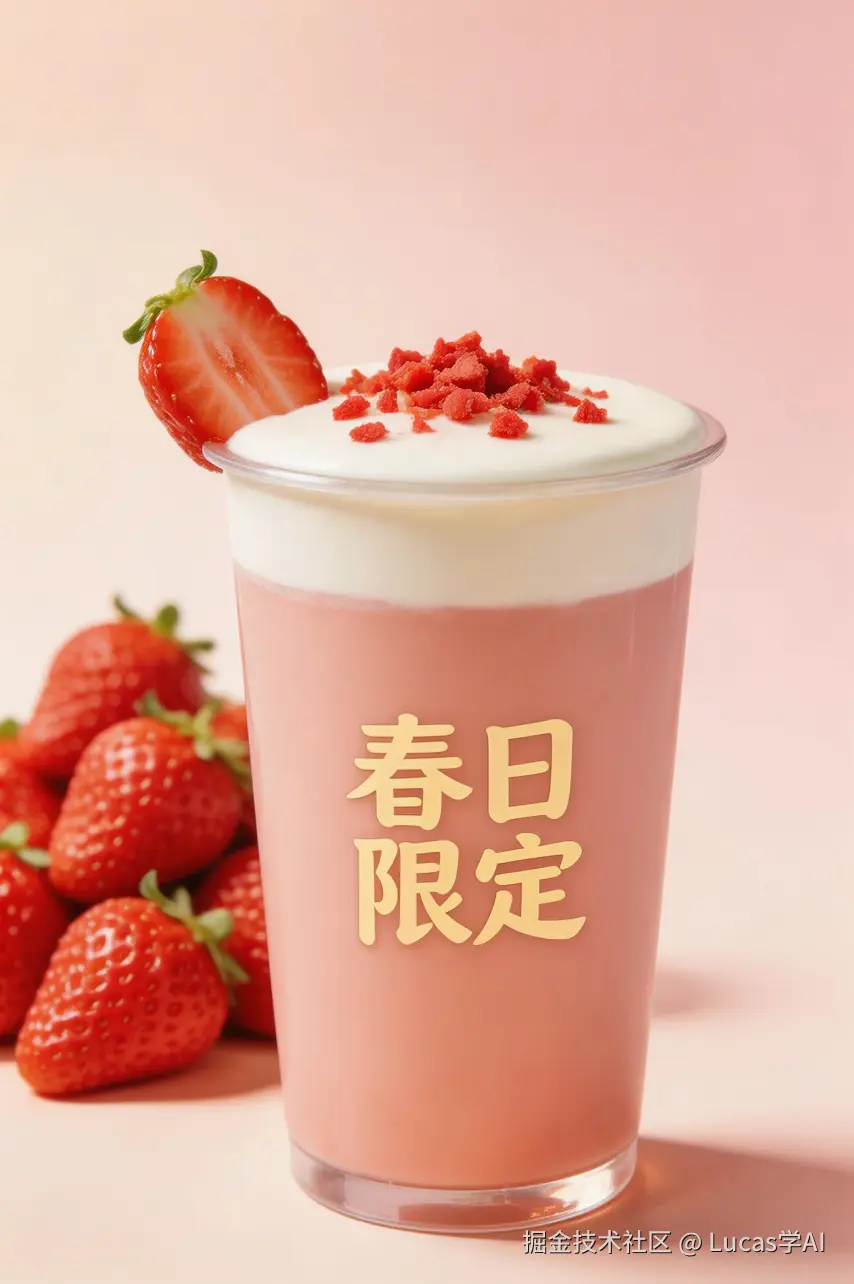 Seedream5.0 lite这次直接加了实时检索增强。我帮他试了一下,输入 “一杯草莓芝士奶茶,杯身印着‘春日限定’四个字,背景有新鲜草莓堆,商业海报感” 。