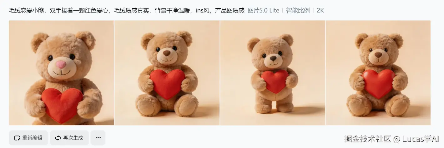 我拿那个卖不动的情人节小熊做测试:输入提示词 “毛绒恋爱小熊,双手捧着一颗红色爱心,毛绒质感真实,背景干净温暖,ins风,产品图质感” 。
