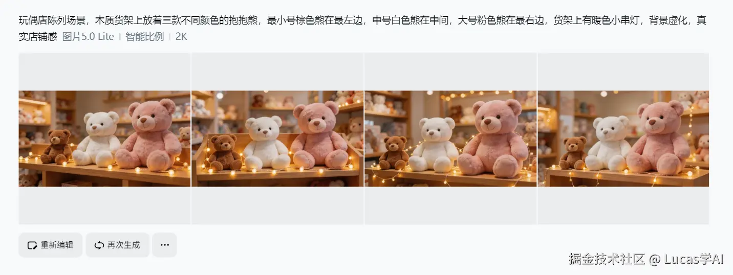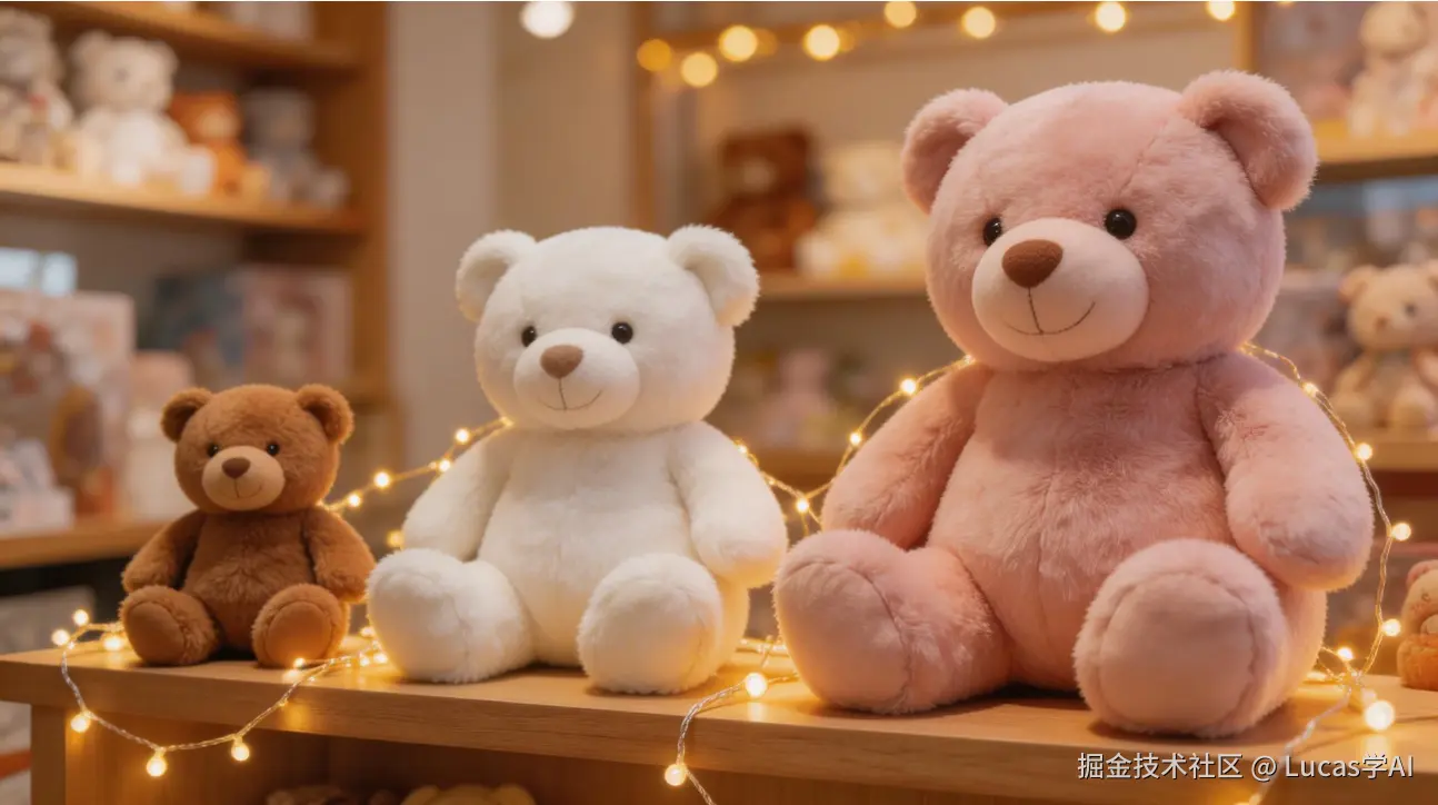 输入提示词: “玩偶店陈列场景,木质货架上放着三款不同颜色的抱抱熊,最小号棕色熊在最左边,中号白色熊在中间,大号粉色熊在最右边,货架上有暖色小串灯,背景虚化,真实店铺感”