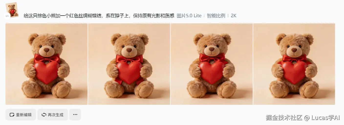 我试了 “给这只棕色小熊加一个红色丝绸蝴蝶结,系在脖子上,保持原有光影和质感” 。