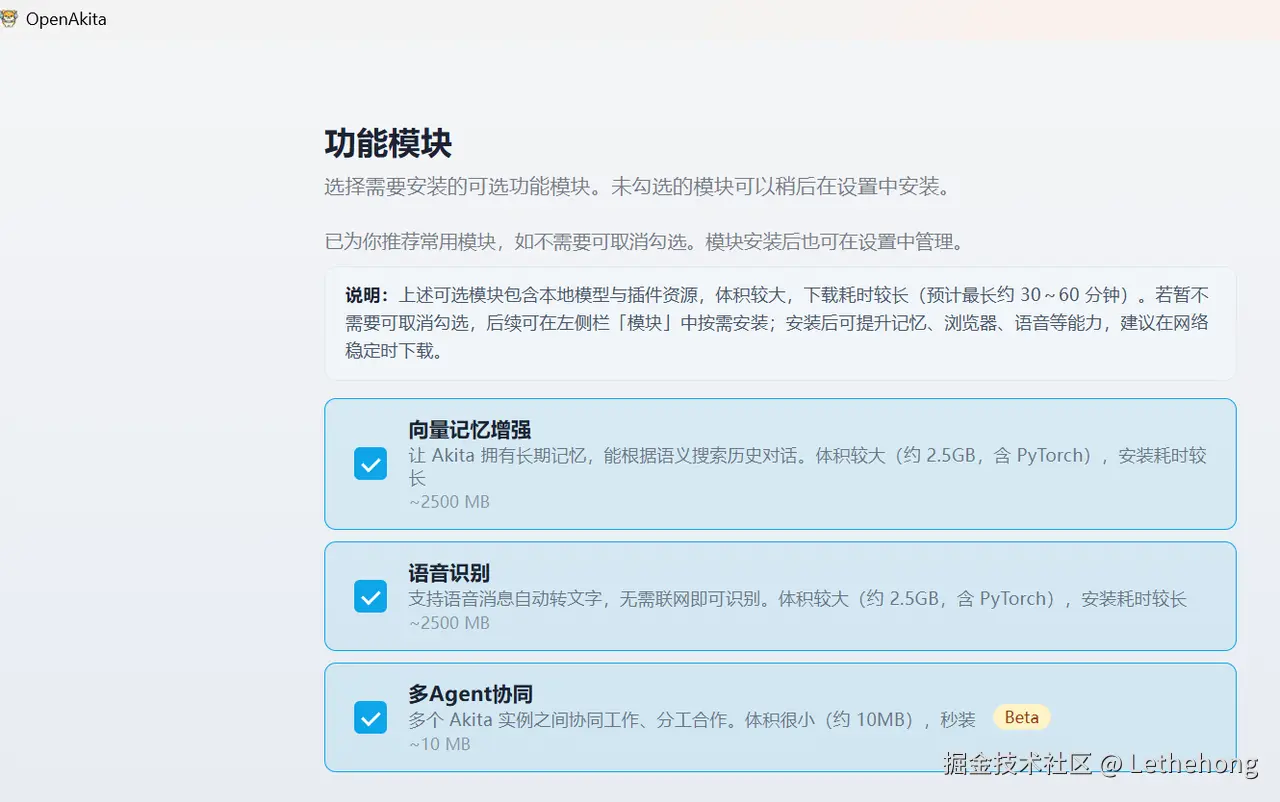 在 OpenAkita 的设置中心里,根据你的需求勾选功能模块