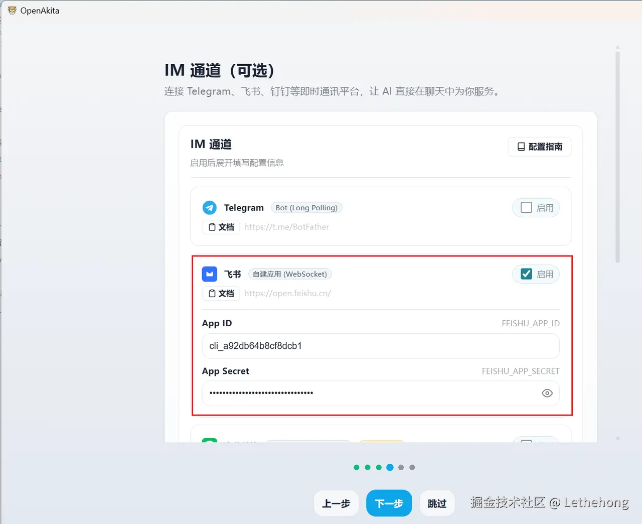 在 OpenAkita 的飞书接入配置中,填入刚才的 App ID 和 App Secret,按向导完成配置。