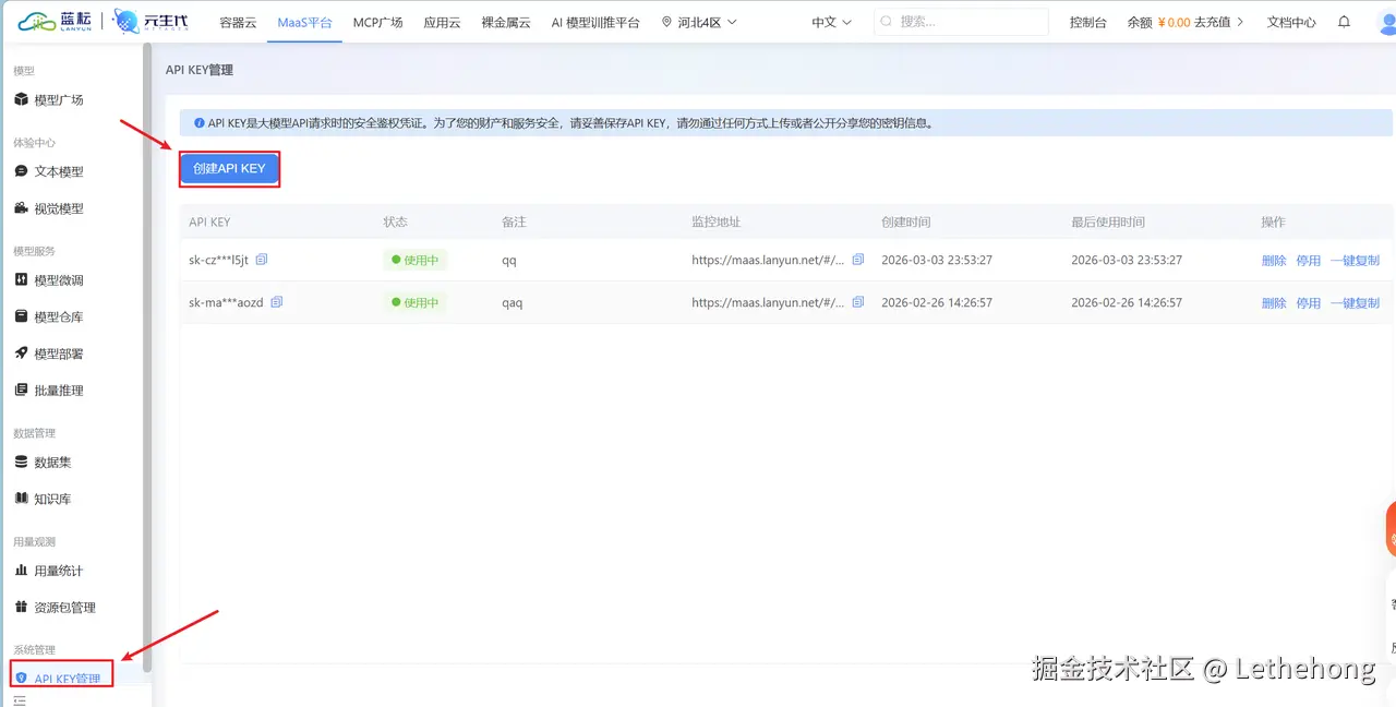 3.2 获取蓝耘 API Key