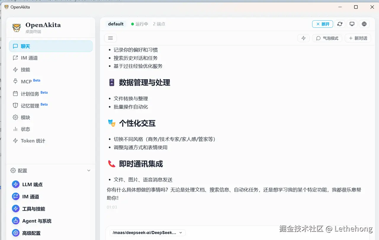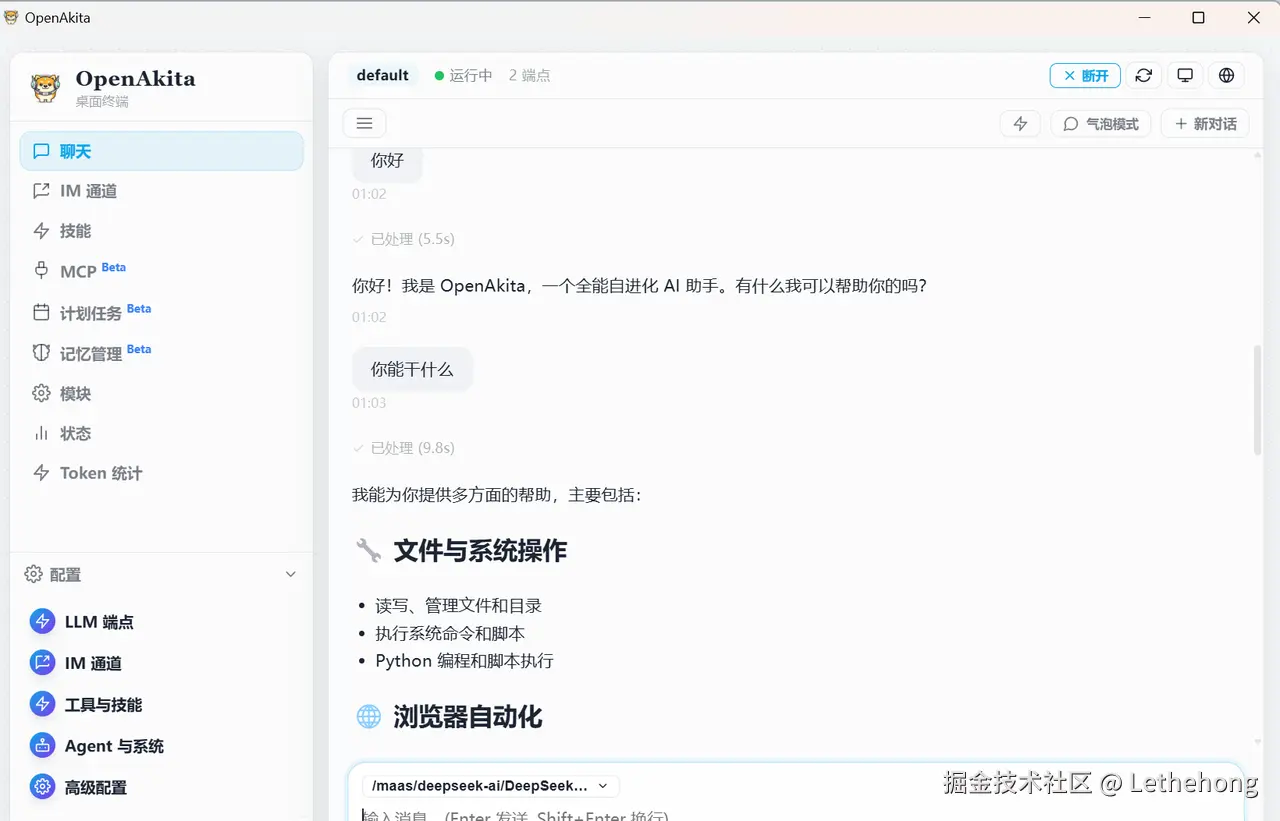 通过 OpenAkita + 蓝耘 DeepSeek API,我们可以在本地搭建一个: