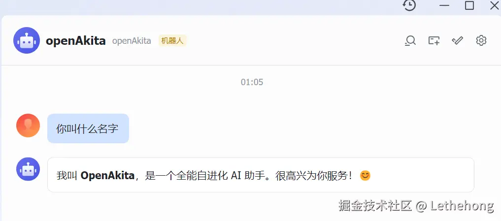 - 在飞书中,尝试给机器人发一条消息,看是否能收到 OpenAkita 的回复。