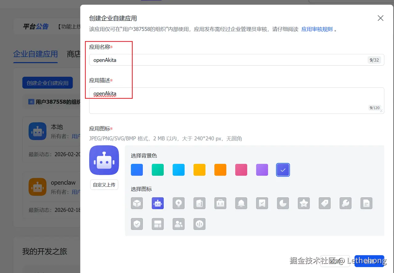 - 进入飞书开放平台,创建企业自建应用,选择“机器人”类型。