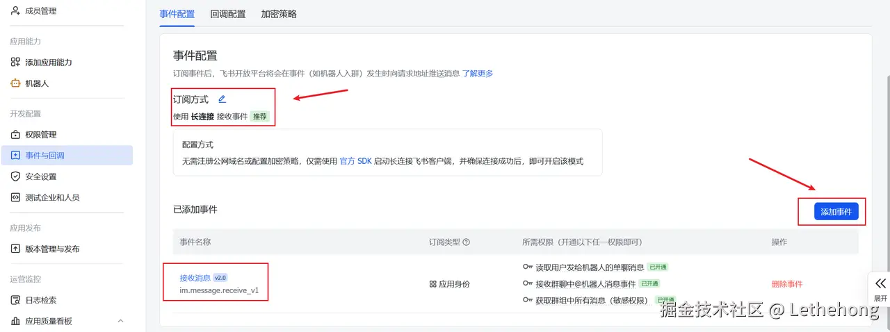 在飞书开放平台的“事件与回调”中: