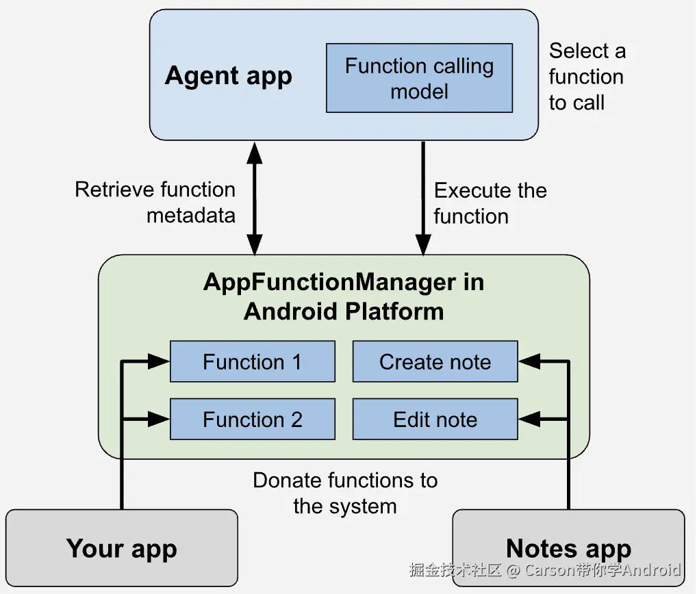 - AppFunction 选择和执行:根据用户提示,代理将选择并执行具有相应形参的相应 AppFunction。