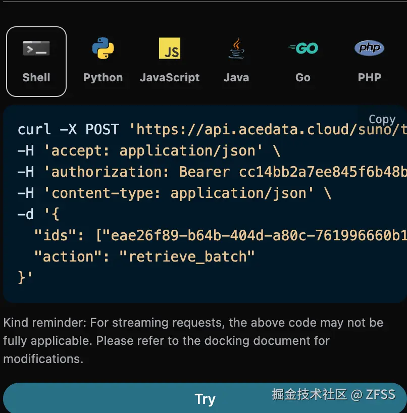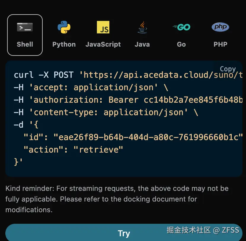 我们以 Suno Audios Generation API 服务返回的任务ID一个为例,演示如何使用该 API。假设我们有一个任务ID:eae26f89-b64b-404d-a80c-761996660b1c,接下来演示如何通过传入一个任务ID来。