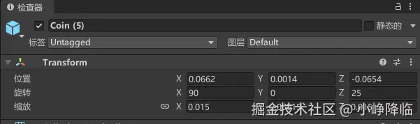 将金币调整大小和位置,适配整体大小,并制作成预制体,如下只需要注意旋转和缩放即可,位置在场景自由拜访
