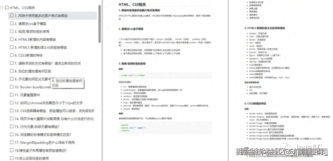 这份面试题文档的主要内容包括九个相关模块:HTML相关,CSS相关,JavaScript相关,jQuery相关,浏览器 相关,HTTP相关,Vue相关,React相关,小程序相关。