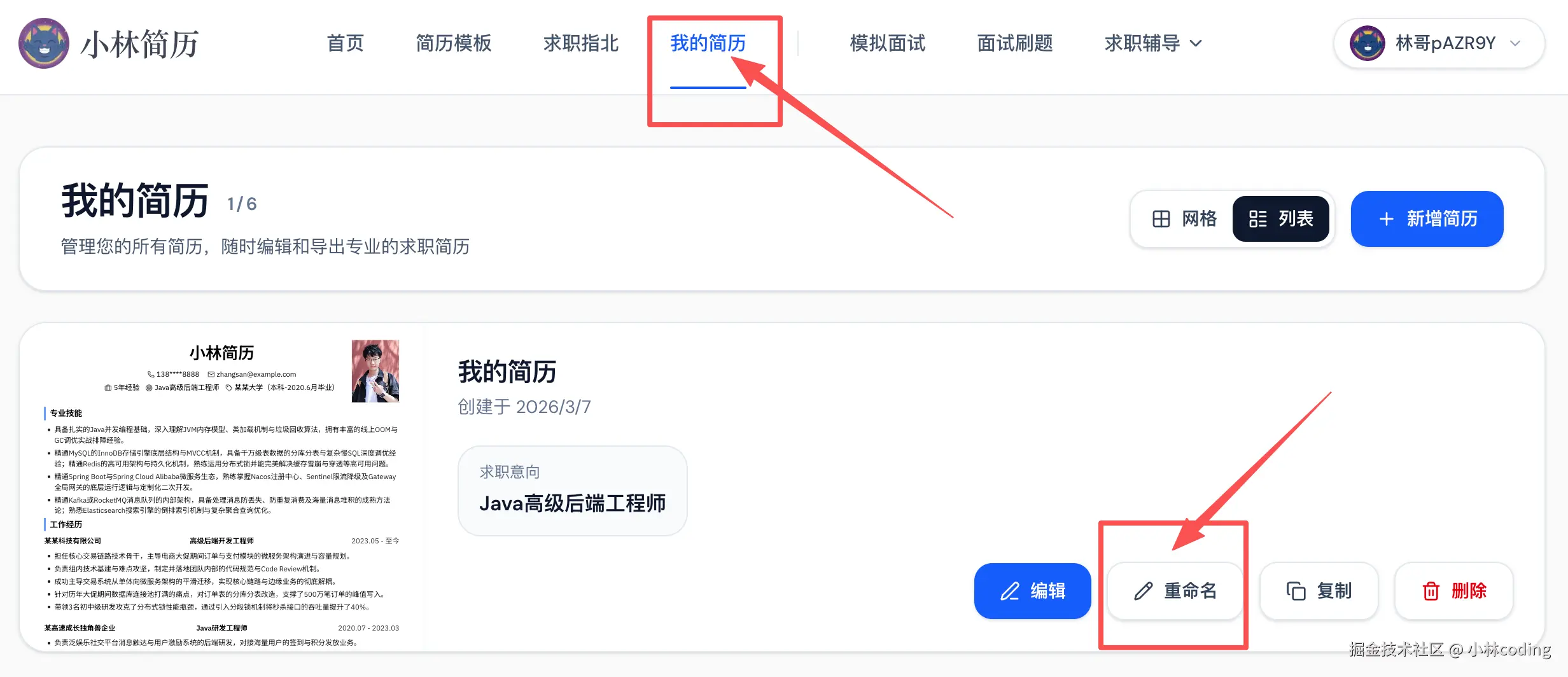 对了,简历文件名也很重要,如果大家想设置导出简历的 PDF 名字,可以在「我的简历」找到你的简历模版,然后点击「重命名」,你在这里改好的名字,就是最终导出 PDF 的文件名了。