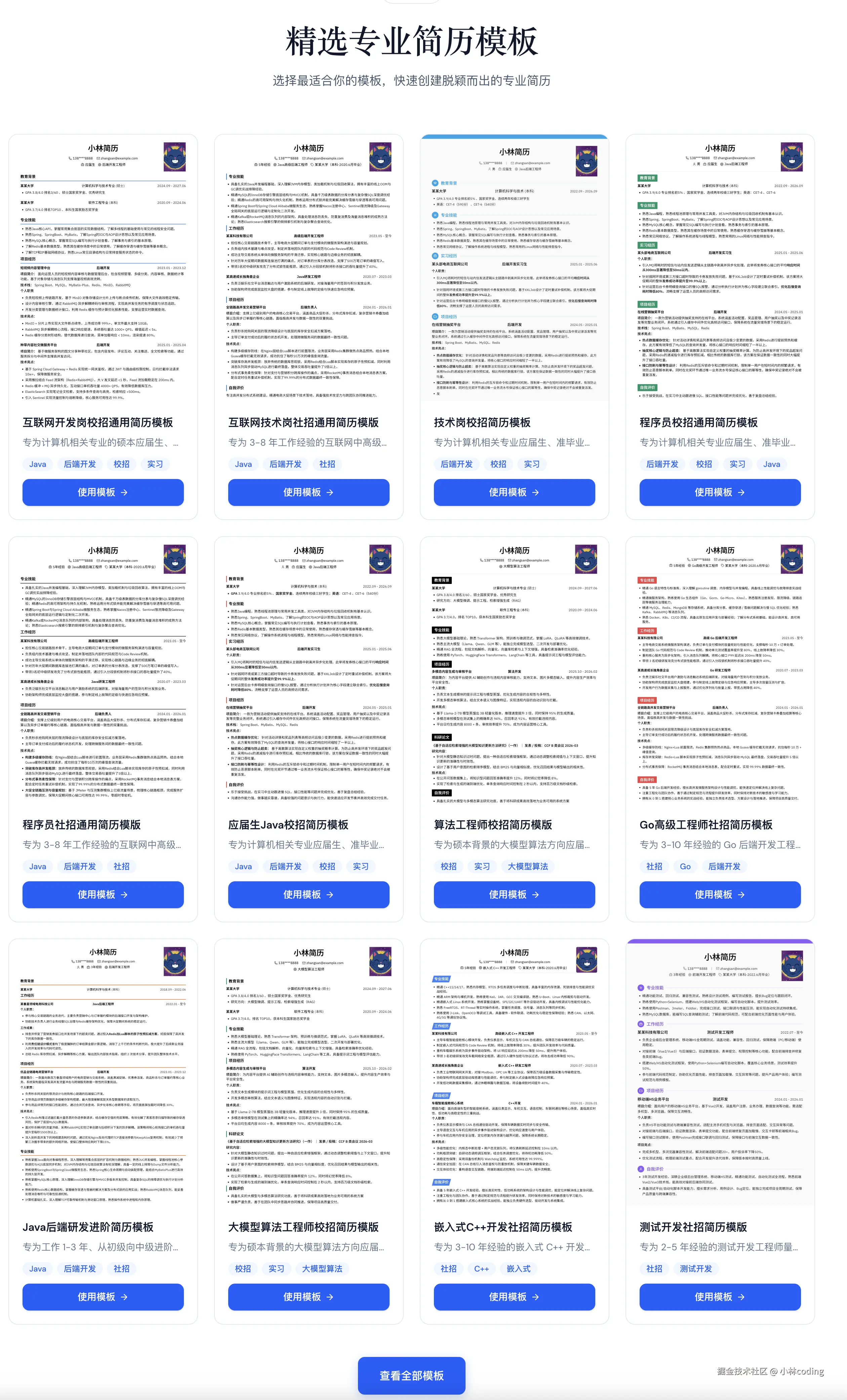 跟市面上那些冷冰冰的生成器不一样,「小林简历」是真正懂咱们技术人的。目前网站上提供了 20+ 精美的简历模板,而且针对各个技术方向做了细分定制
