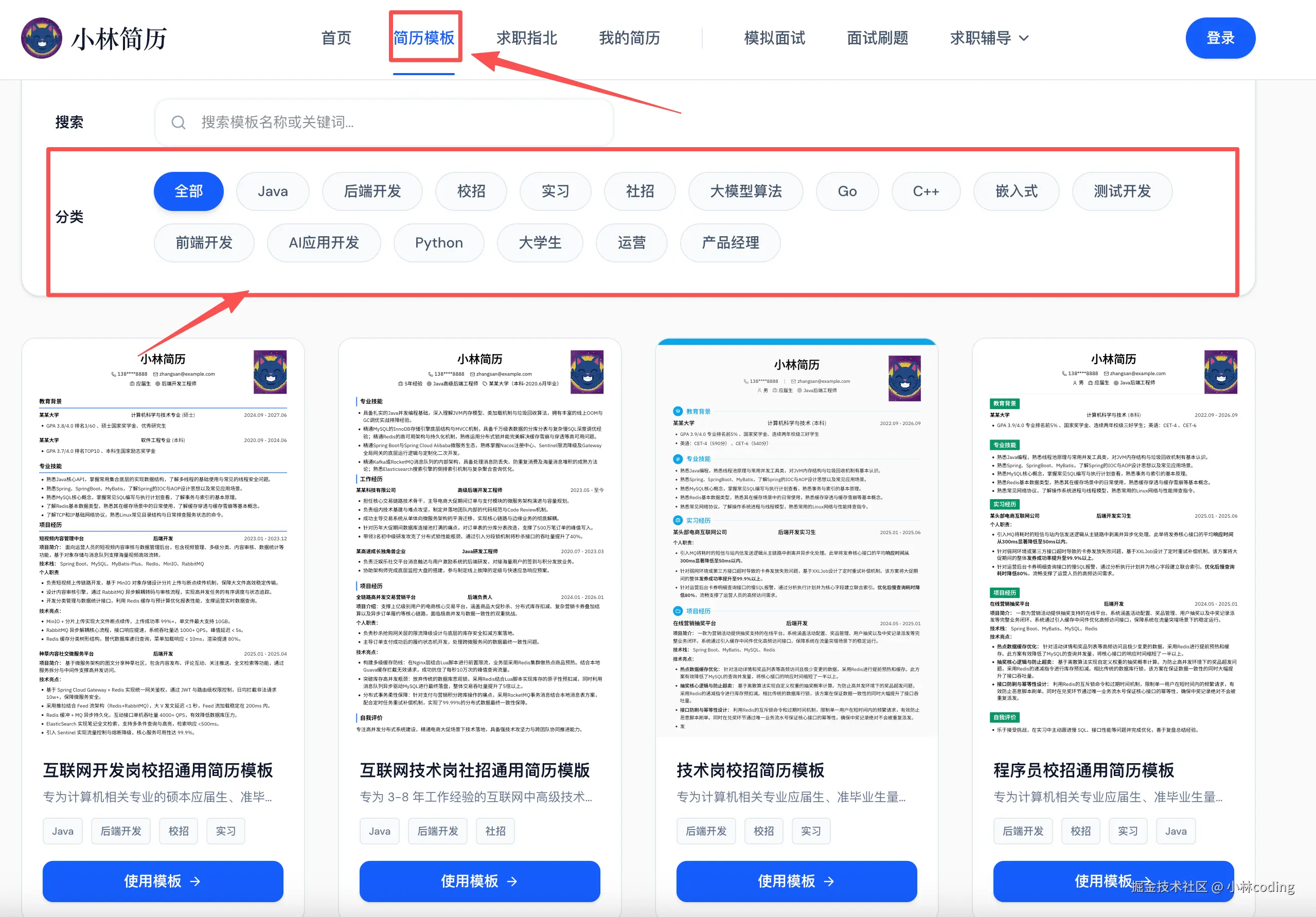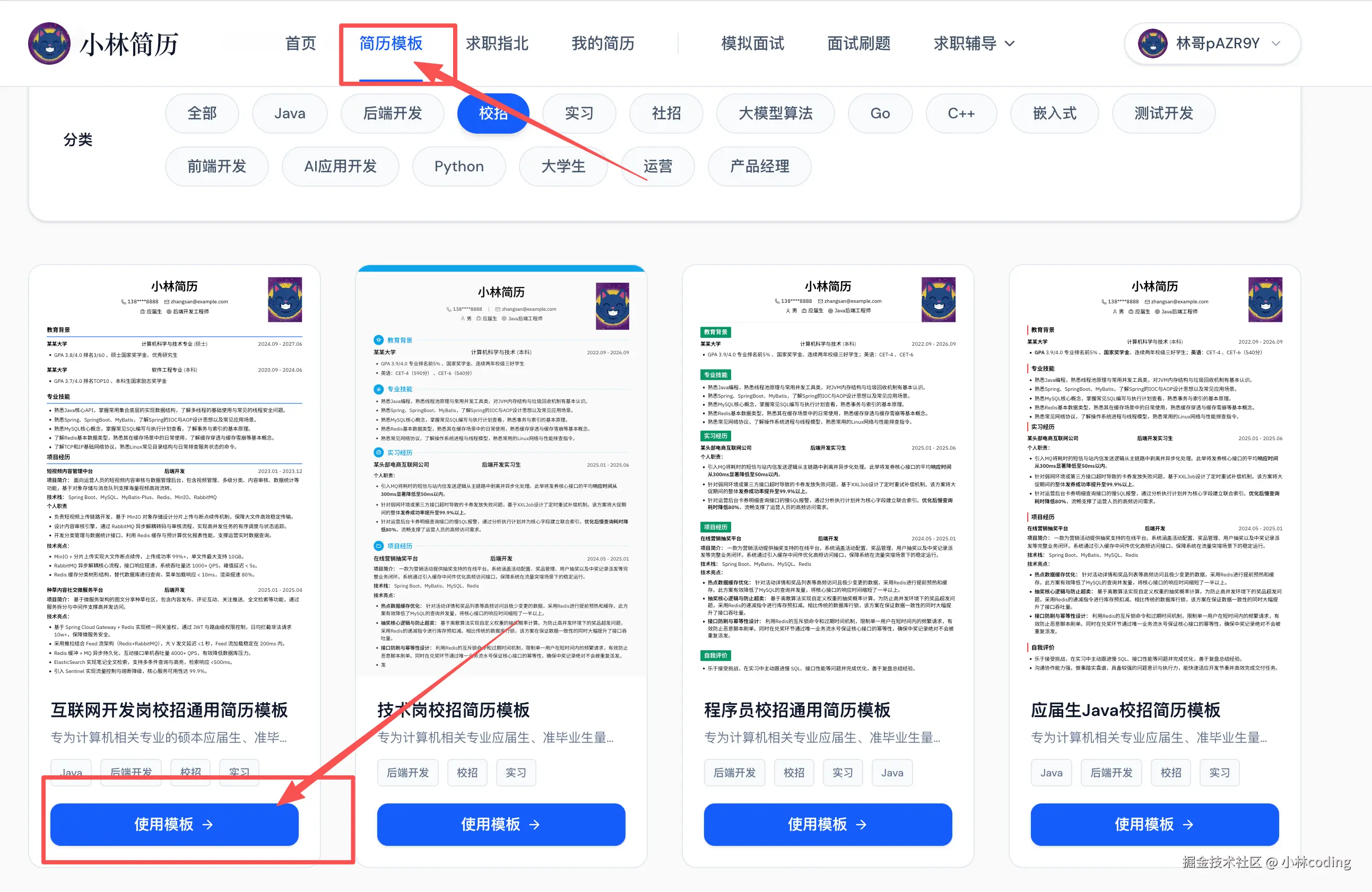 - 第一步: 电脑端浏览器打开网址 👉 https://jianli.xiaolinnote.com/ ,在首页找到你心仪的简历模版,直接点击「使用模版」。