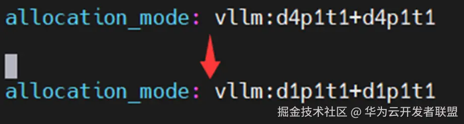 修改配置文件gsm8k_grpo_npu.yaml调整训推的卡资源分配以及并行方式,默认为4卡推理+4卡训练,都使用DP并行,下面给出调整为单卡推理+单卡训练的配置调整方式: