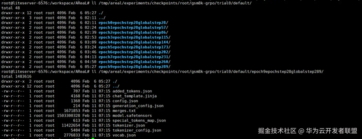 训练结束后新的模型文件默认在/tmp/areal/experiments/下,可通过gsm8k_grpo_npu.yaml配置文件fileroot参数调整文件路径: