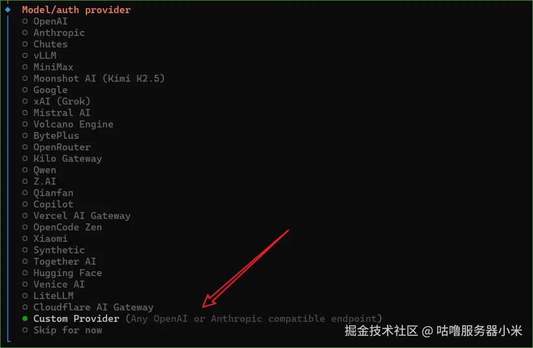 选择 Custom Provider (Any OpenAI or Anthropic compatible endpoint)