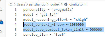 model_context_window = 1050000 model_auto_compact_token_limit = 900000