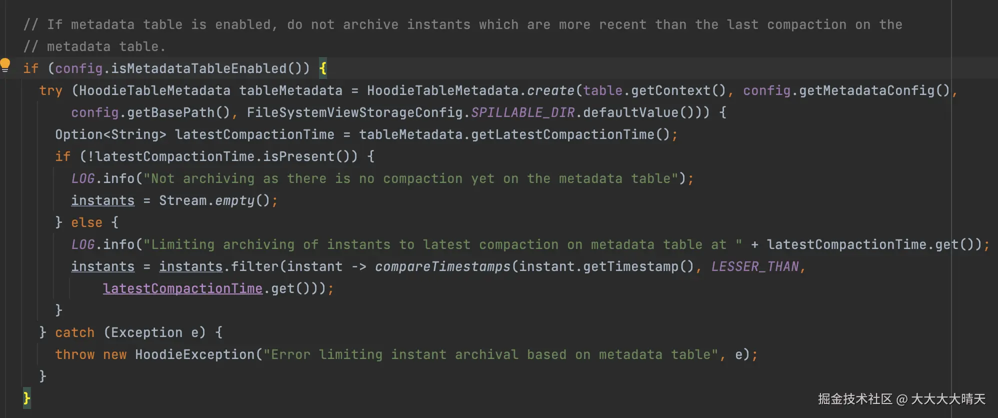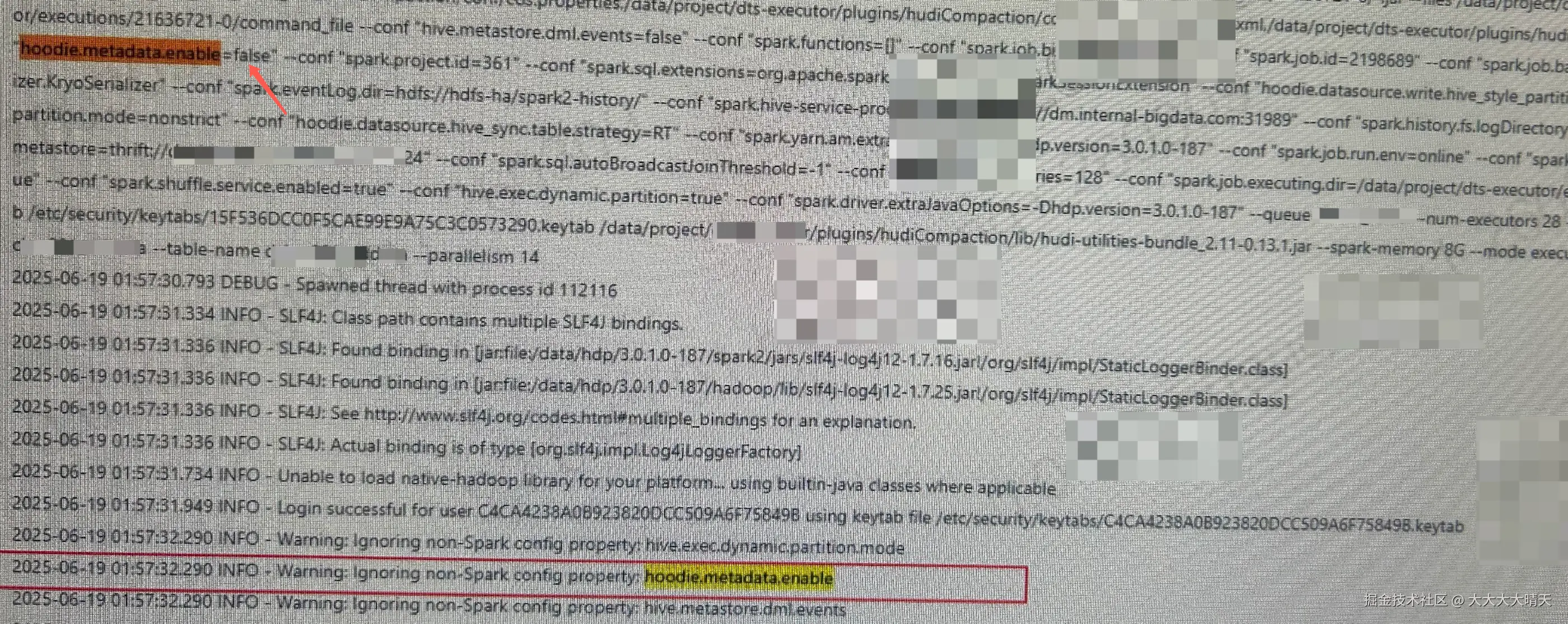 抱着试一试的心态继续查看Spark任务运行日志,结果发现了线索:Hudi元数据表配置关闭的,但是Spark任务启动初始化识别为non-spark config被过滤了(查阅官方文档spark-hudi集成下hoodie.metadata.enable默认是true)。我们联系Spark平台同事确认Hudi任务的传参方式,反馈结果是经过验证确认Hudi任务自定义参数(非spark)在平台上的传入方式有bug,无法在Spark生效。虽然心里闪过一千匹马,但问题点也基本明确方向了。不过为啥会导致这个异常报错呢?