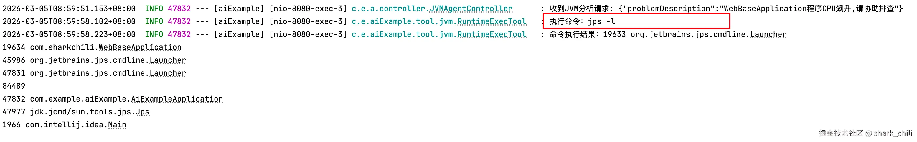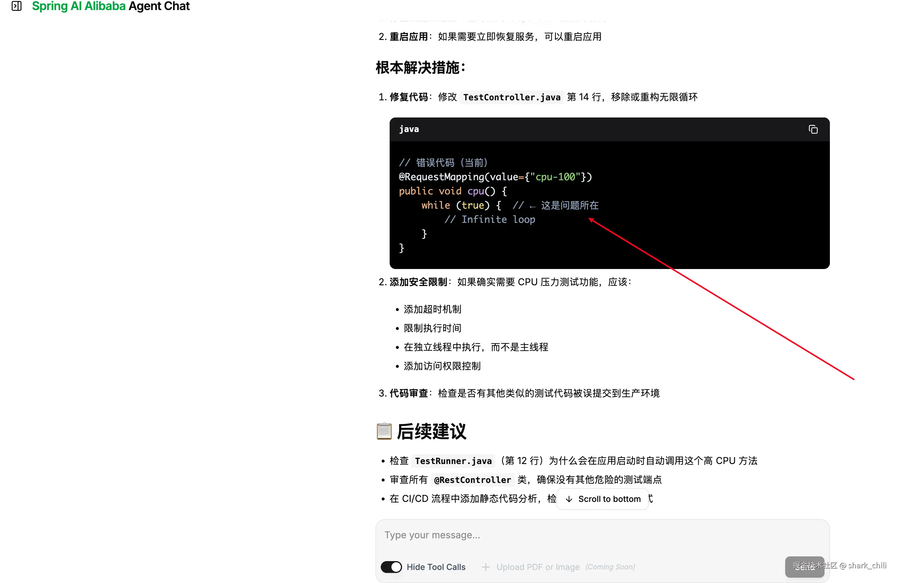 到这为止,我们就已经完成一个完整的chat agent构建,最后,我们只需将程序启动,并访问:<http://localhost:{应用端口号}/chatui/index.html>,并在聊天框输入:WebBaseApplication 程序CPU飙升,请协助排查