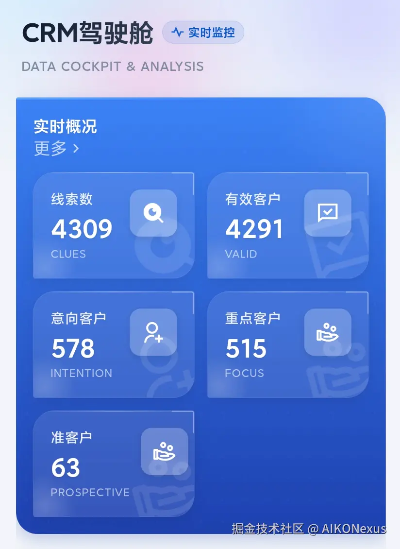 AI描述示例数据大屏卡片以主题色为背景,添加轻微的磨砂材质(噪点/颗粒质感),再添加很浅的白色网格