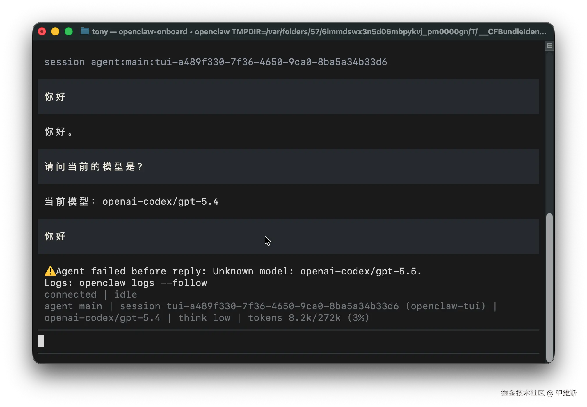 为了对比验证,我把配置文件中的模型改成 gpt5.5,再问的话立马就不行了。这样可以侧面证明 gpt-5.4 确实是生效了,而且必须是这个名字。