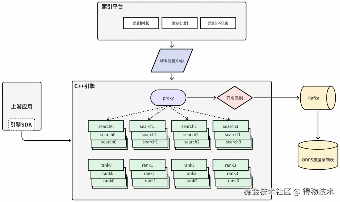DIFF 和压测的核心前提只有一个:真实、稳定、可复用的流量。因此我们优先建设了搜索 C++ 引擎的流量录制链路,作为后续所有测试能力的基础。
