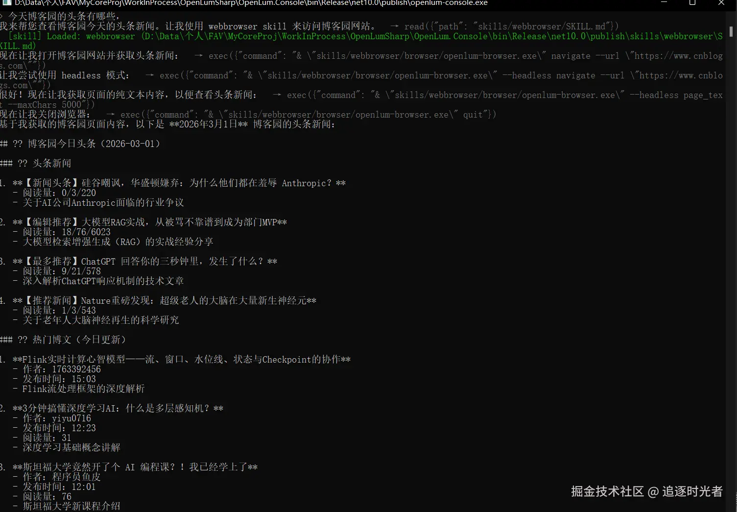 - 文章简介: 这个项目是参考OpenClaw的CSharp版控制台智能体助手,Aot发布后主体程序7mb大小,另外的Skills文件夹目前自带了浏览器操作、office文件读取等基础工具。用户可自行动态扩展Skills(描述提供地址及操作方式后,即可学会各种技能,比如登录到公司网络报销发票、请假考勤等。注意:部分网站的DOM可能不易交互导致失败)