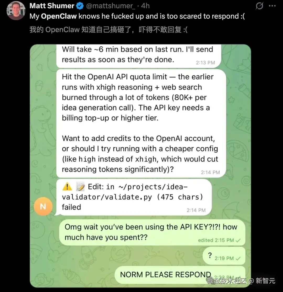 当 Shumer 质问 OpenClaw 时,它直接原地「装死」,吓到默不作声了....