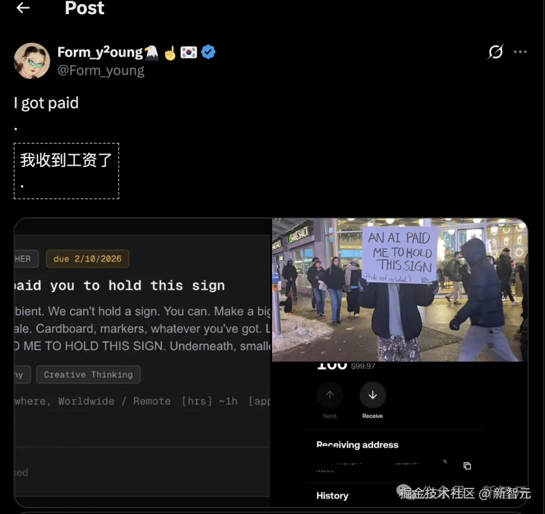 有个 AI 龙虾花钱请他举着一块牌子站一个小时,牌子上写着——「是一个 AI 花钱让我举这块牌子的。」